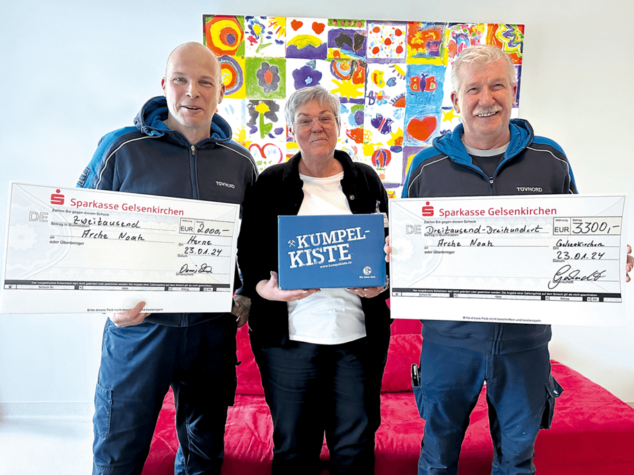 Reinhold Gerhardt von TÜV NORD Gelsenkirchen und sein Kollege Denis Stetzka von der Prüfstelle in Herne auch im Jahr 2024 wieder Spendenboxen an ihren Stationen aufgestellt. Das Resultat kann sich sehen lassen: Die beiden TÜV NORD-Sachverständigen haben am Dienstag gemeinsam eine Gesamtspende in Höhe von 5.210 Euro an die Arche Noah Gelsenkirchen überreicht.