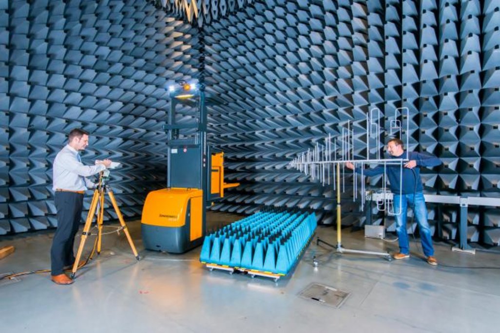 In der Absorberhalle geht es um zwei unterschiedliche Testdurchläufe. Zunächst wird mit der größeren Antenne die Störaussendung überprüft. Dabei wird getestet, ob der Kommissionierer andere Geräte stört. „Besteht das Fahrzeug diesen Test nicht, kann es bedeuten, dass er möglicherweise Computer stört, wenn der betreffende Kommissionierer im Lager vorbeifährt“, sagt Michael Wiese.